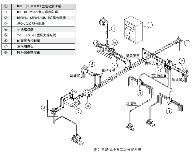 双线式干油集中润滑系统主要由电动润滑泵(包括贮油筒和滤油器等),换向阀、主管道、分支管道、各级分配器、